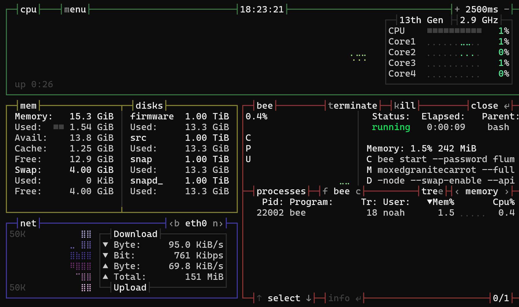 There are many different ways to monitor your Bee node's process, but one convenient way to do so is the bashtop command line tool. The method of installation will vary depending on your system.