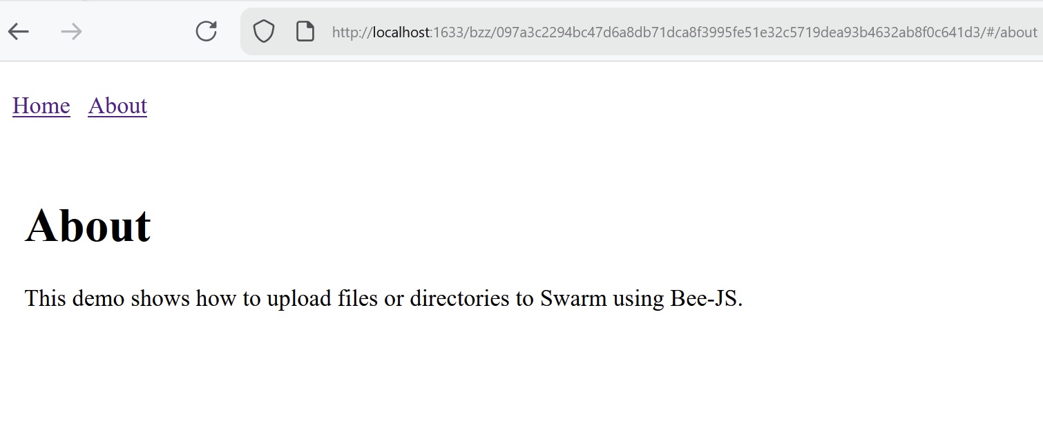 Swarm only serves literal files, so /#/about is the only reliable way to have “pages.”